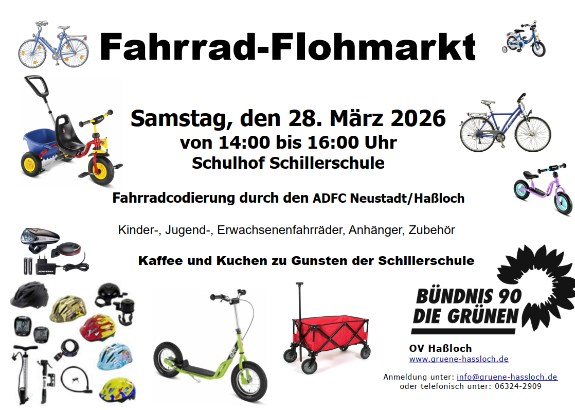 Am Samstag, den 28.03.2026 findet in der Zeit von 14:00 bis 16:00 Uhr der diesjährige Fahrrad-Flohmarkt der Haßlocher GRÜNEN auf dem Schulhof der Schillerschule statt.
